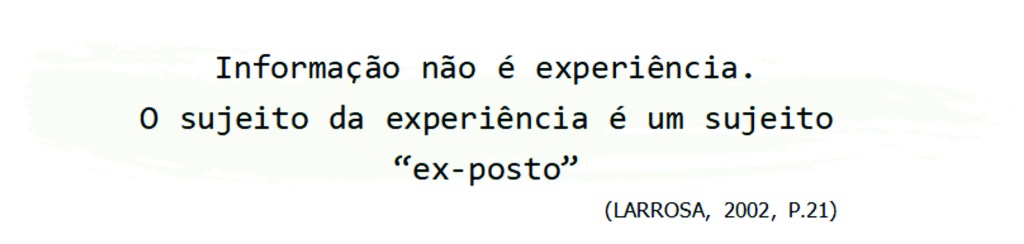 Jorge Larrosa diz que a experiência é, em espanhol, “o que nos passa”. Em português seria “o que nos acontece”, ou seja, a experiência é o que nos passa, o que nos acontece, o que NOS TOCA!