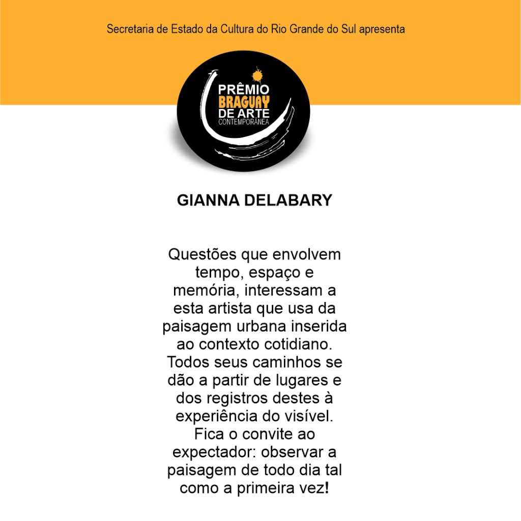 Gianna Delabary nasceu em Sant’Ana do Livramento (RS – Brasil), em abril de 1997. Bacharela em Arte Visuais (2021) pela Universidade Federal de Pelotas, ministrou em 2017 um curso de extensão de desenho da figura humana com modelo vivo. Dedica-se à diversas linguagens, tais como pintura, desenho, fotografia e vídeo. Em seus trabalhos, trata sobre questões do cotidiano, paisagem, tempo e esquecimento pensados a partir de seu olhar e posicionamento diante do real, a experiência do visível única para cada um. Participou das exposições Desafio 5×5 (2019) com o desenho “SEMIAUSÊNCIA” e Intervencidades– conversa entre espaços (2020) com a intervenção “Partir para Retornar”.